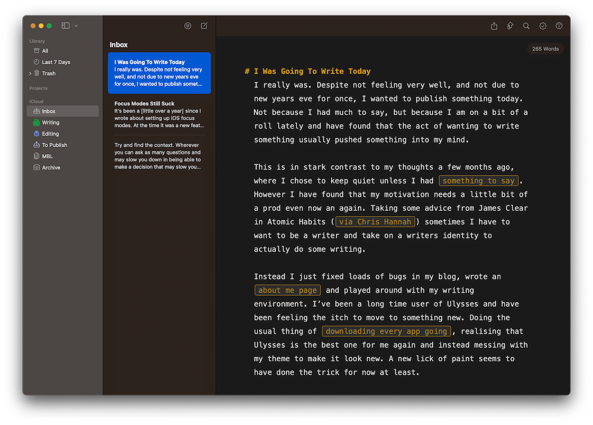 Instead, I just fixed loads of bugs in my blog, wrote an about me page and played around with my writing environment. I’ve been a long-time user of Ulysses and have been feeling the itch to move to something new. Doing the usual thing of downloading every app going, realising that Ulysses is the best one for me again, and instead messing with my theme to make it look new. A new lick of paint seems to have done the trick for now at least.