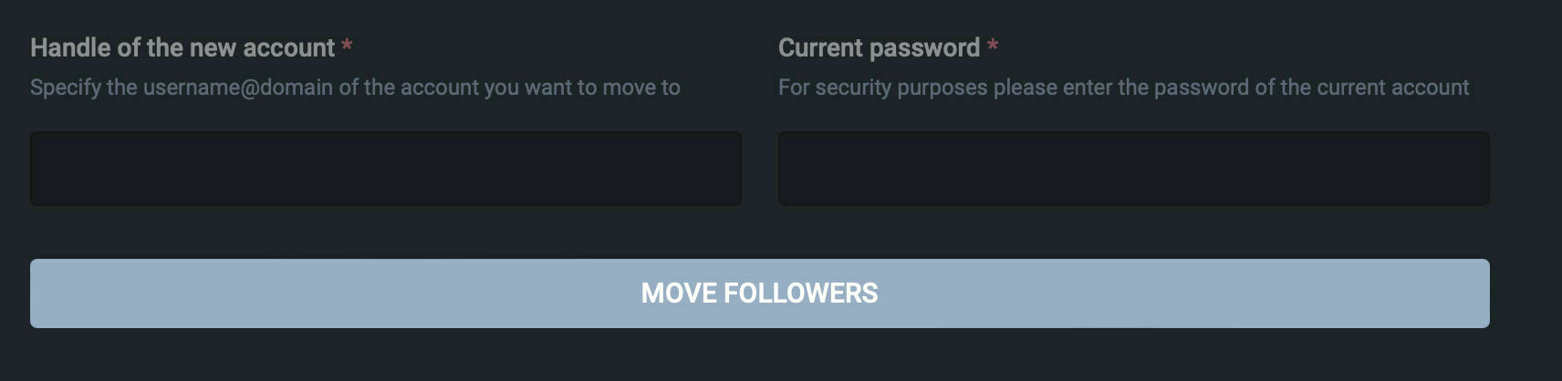 On your Mastodon instance, head to Settings > Account and towards the bottom you will see Move to a different account. Here you need to add in your new micro.blog Mastodon compatible username, and then put in your password.