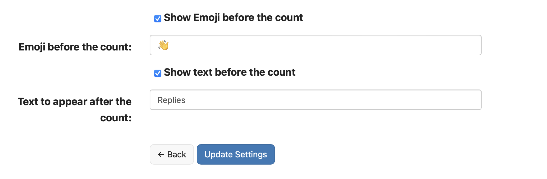 To aid styling you can add in your own emoji to appear before the number, as well as your own text to appear afterwards. If thats not your thing then either options can be toggled on/off in the plugin settings.