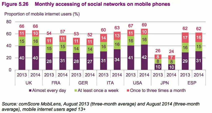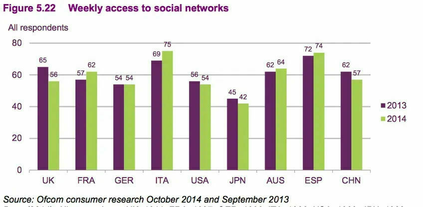 The largest decline in weekly access to social networks coming from users in the UK – dropping from 65% to 56%. Declining use also in the US (from 56% to 54%), Japan (45% to 42%), and China (62% to 57%). Many countries also had increased number of visits, however, such as France, Italy, Australia and Spain.